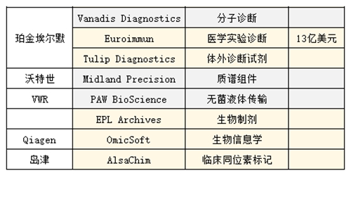 這其中最活躍的當屬珀金埃爾默了,從2016年年初收購瑞典分子診斷公司Vanadis Diagnostics就可見端倪。今年先后收購印度最大體外診斷試劑、工具和儀器供應商Tulip Diagnostics和醫學實驗診斷公司EUROIMMUN,瓜分體外診斷市場的野心可見一斑。