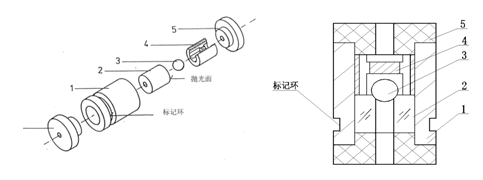 (1 帶標(biāo)記環(huán)閥外套;2 陶瓷座;3 寶石球;4 帶密封墊限位套;5 密封墊)